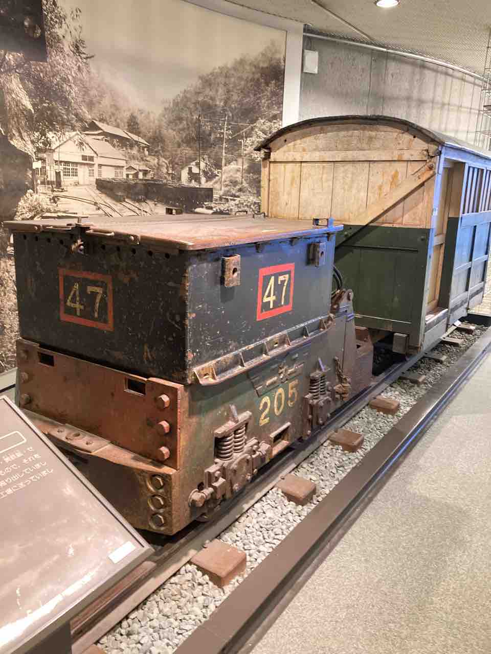 鉱山で働いていたトロッコの実物も