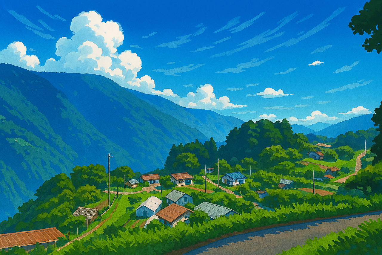 (イラスト:『日本のチロル』と呼ばれる『下栗の里』)