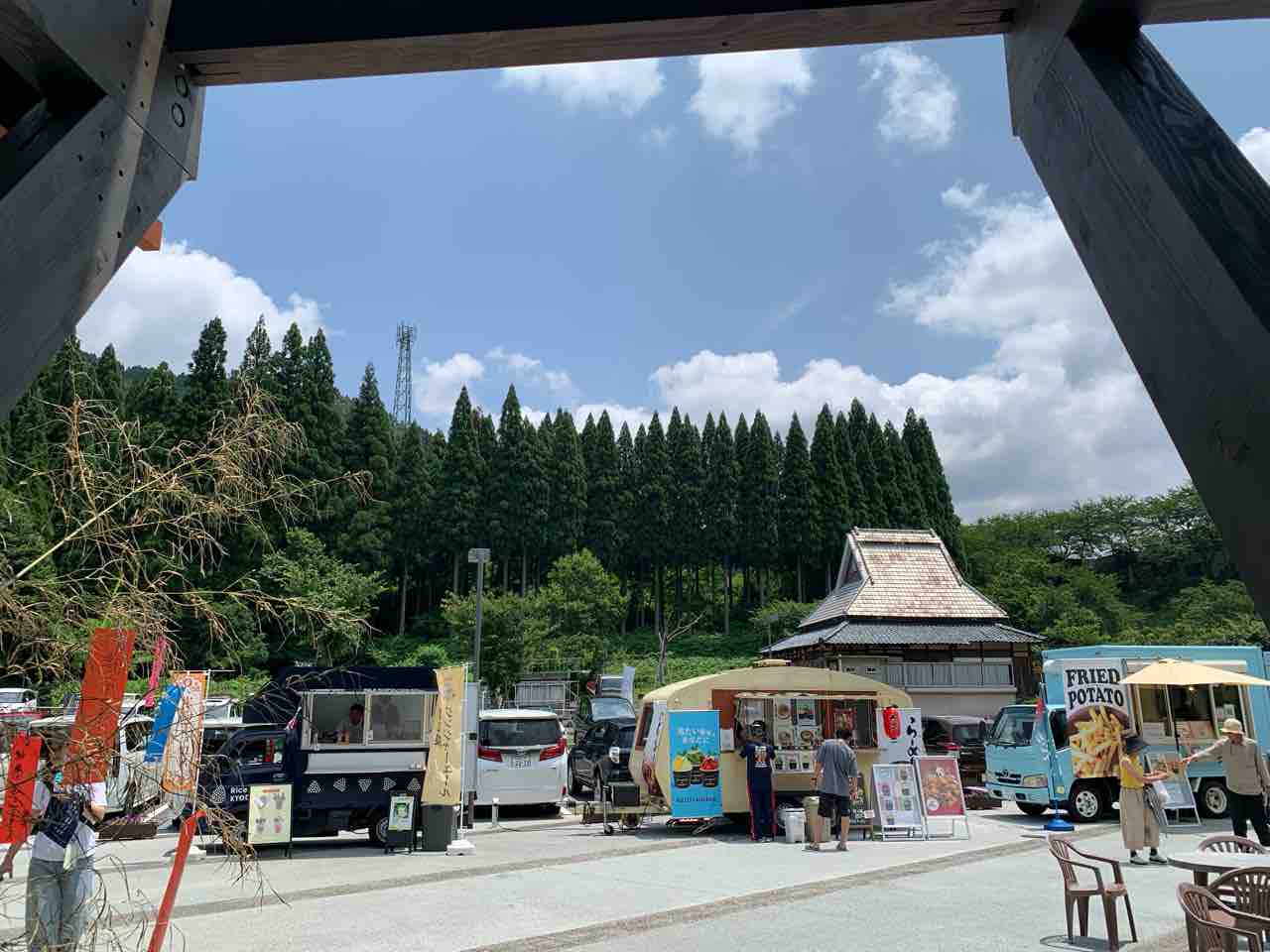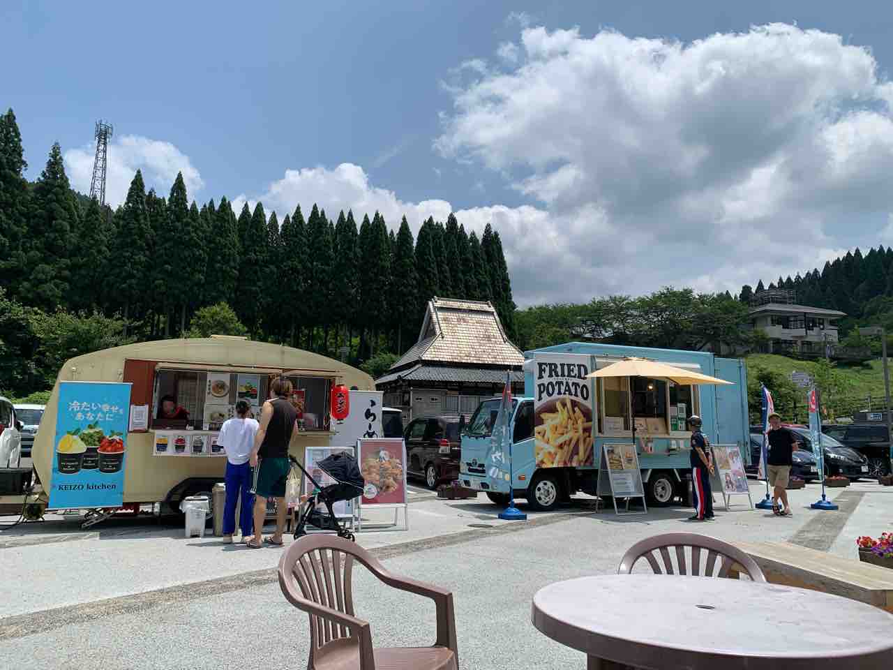 広場にはキッチンカーが多数並び、ポテトや冷たいスイーツ、ラーメンなど様々なメニューが楽しめます。