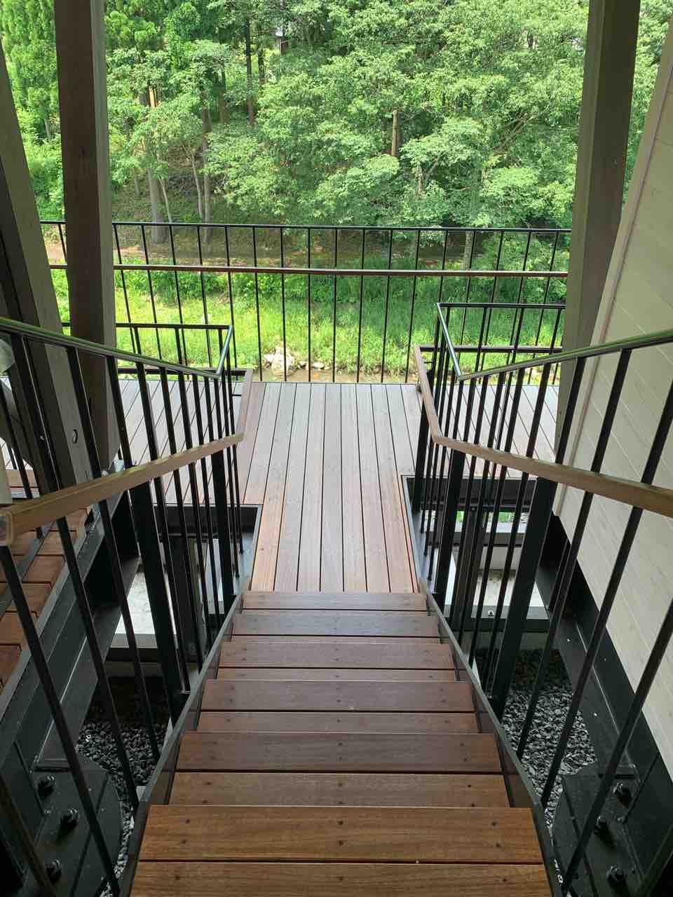 建物の裏側にはウッドデッキと小川が流れる自然豊かな景色が広がっており、まるで森の中にいるような空間でひと休みできます。