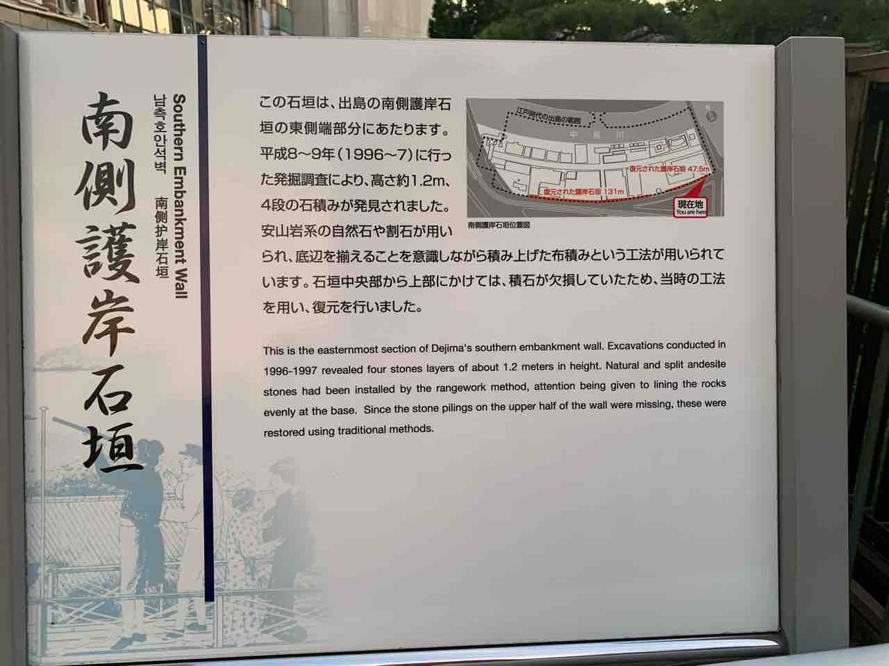 出島は現在陸続きですが、周囲に保存された水路や護岸が往時を物語っています。布積みと呼ばれる工法で石が積まれ、復元には当時の技術が使われています。