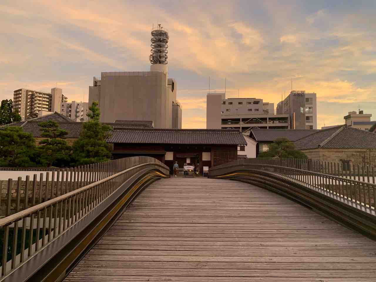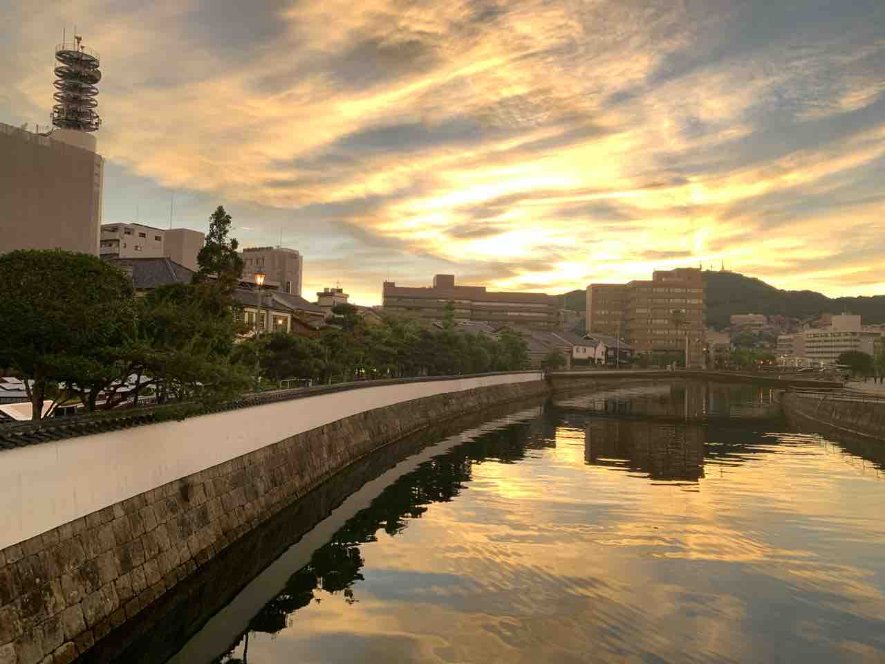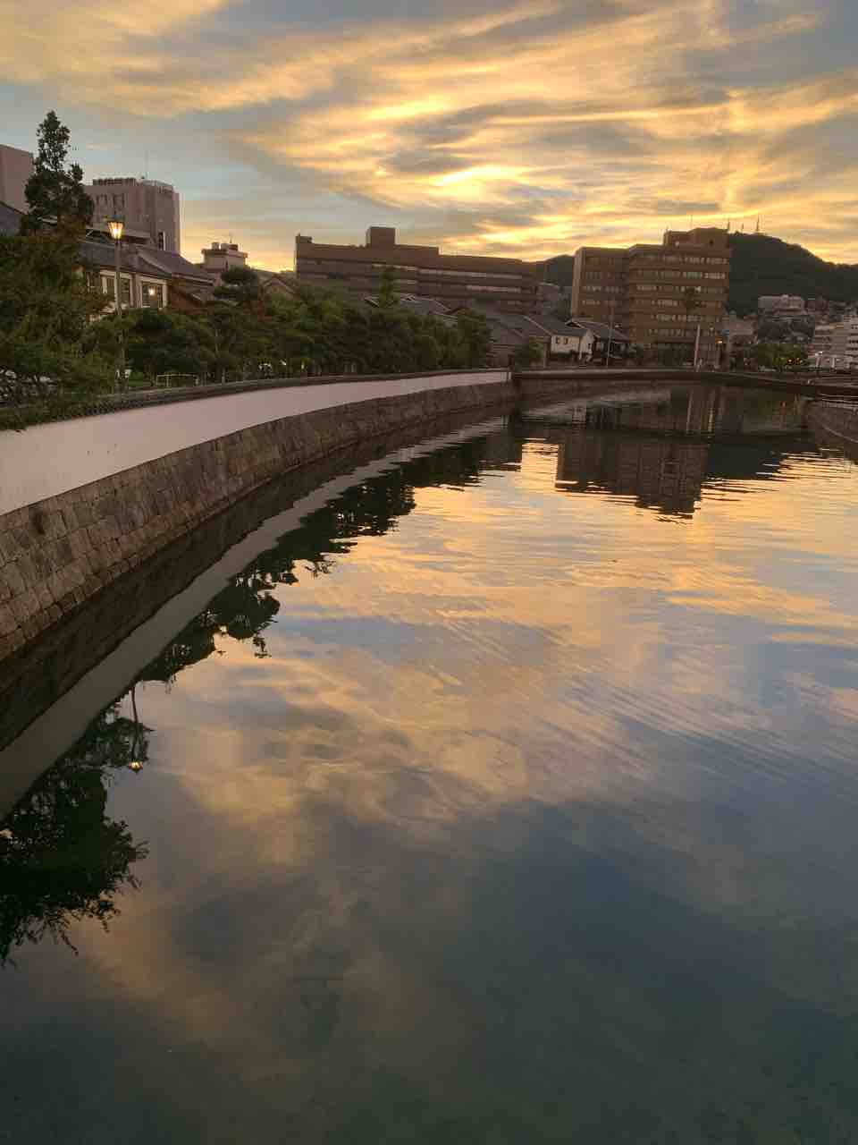 長崎の名所「出島」を訪れたのは夕刻。空が茜色に染まり、川面にその光が映り込む光景は幻想的でした。