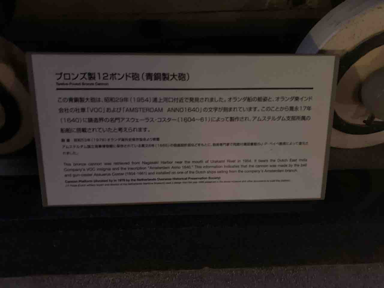 出島には青銅製の大砲も展示されています。オランダ東インド会社の刻印があり、往時の貿易船の装備を今に伝えています。