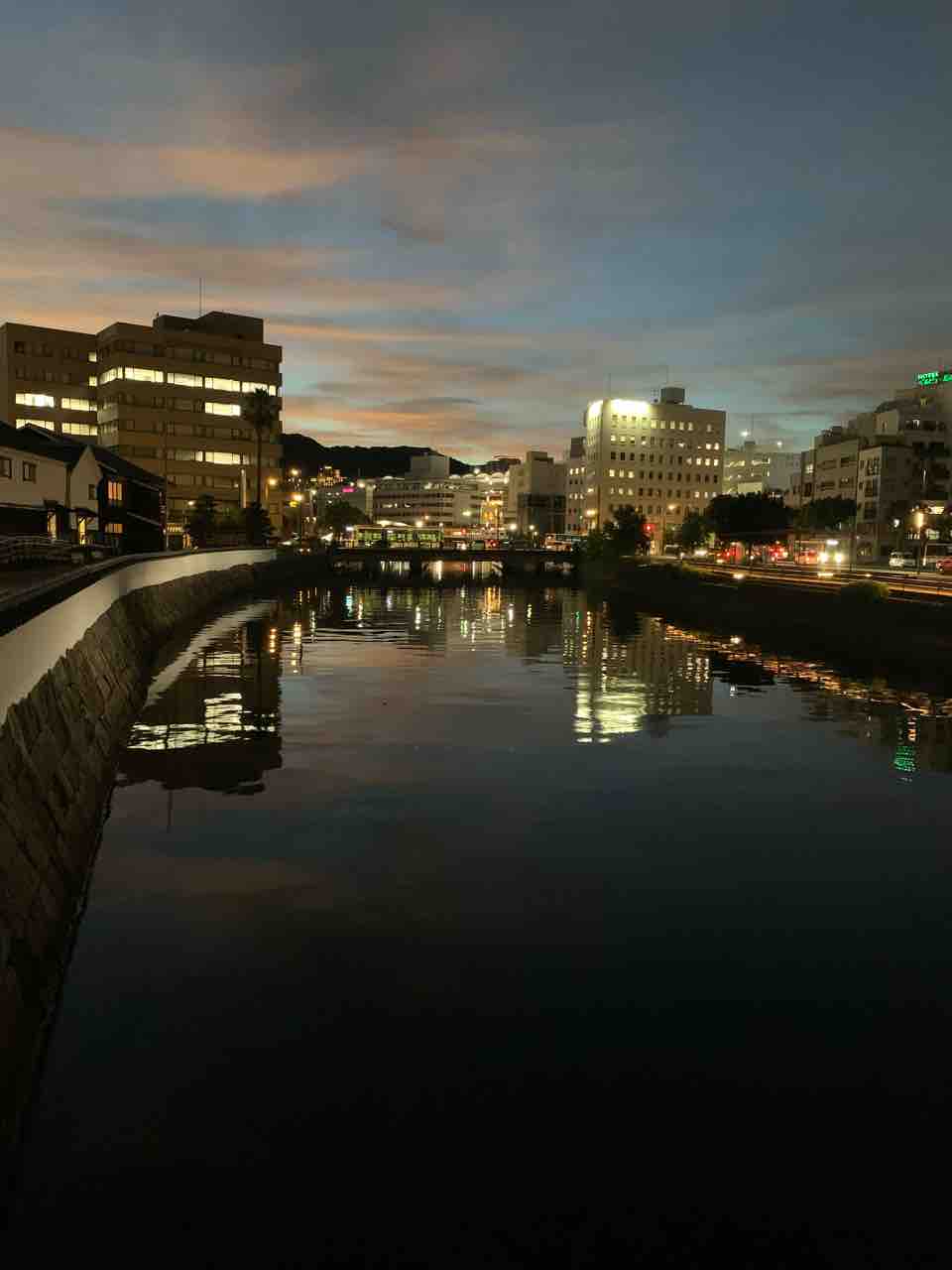 I visited Dejima, a historical site in Nagasaki, at dusk. The sky turned crimson, and its reflection on the water created a magical scene.