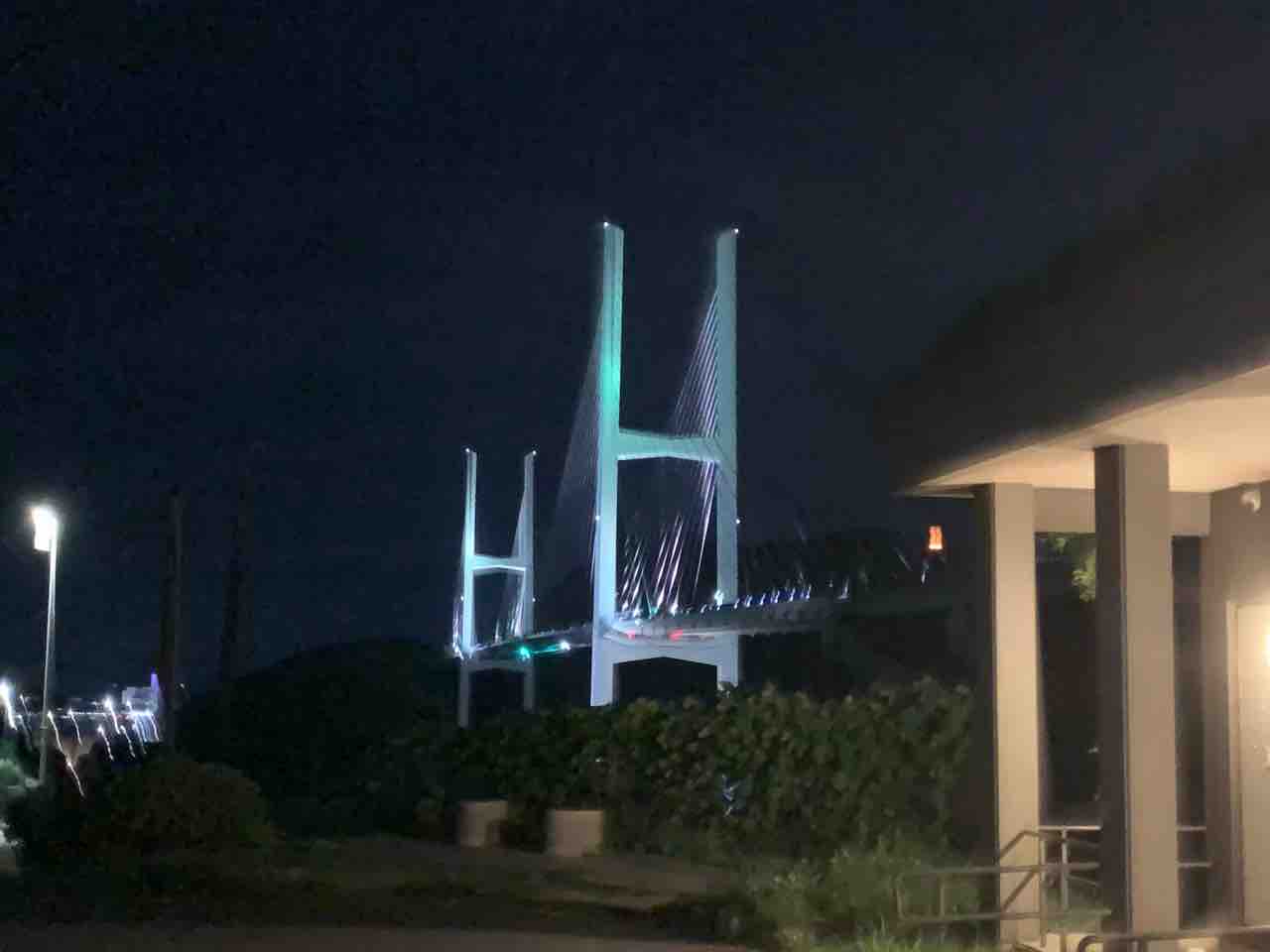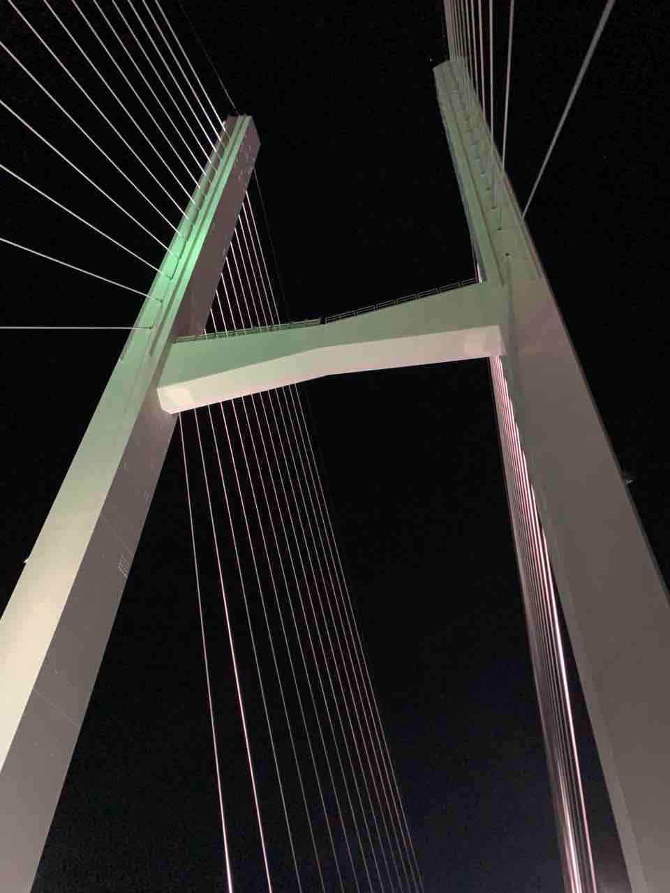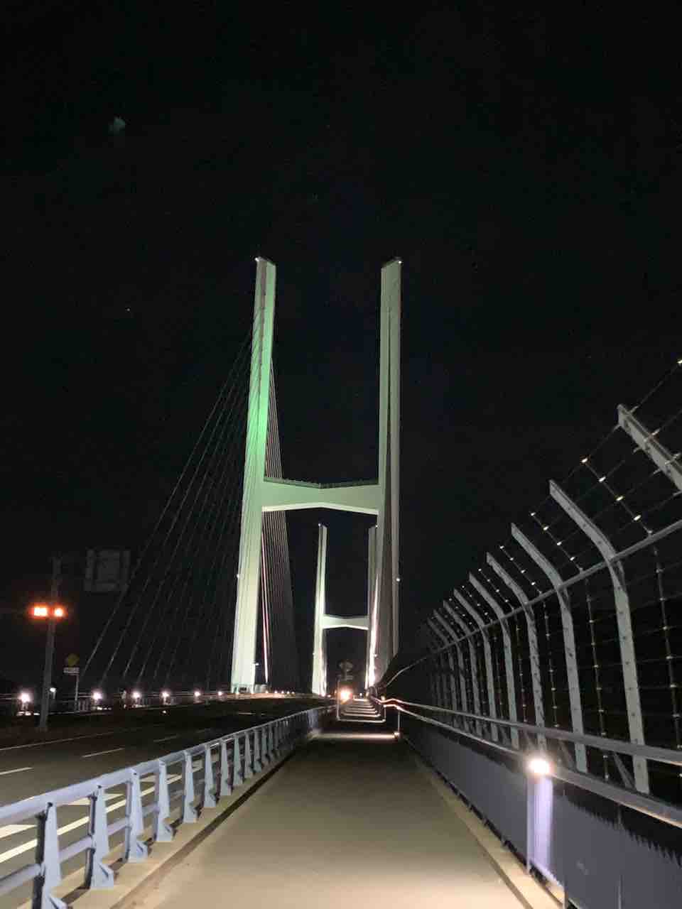 夜になると主塔とワイヤーがライトアップされ、幻想的な雰囲気に包まれます。
