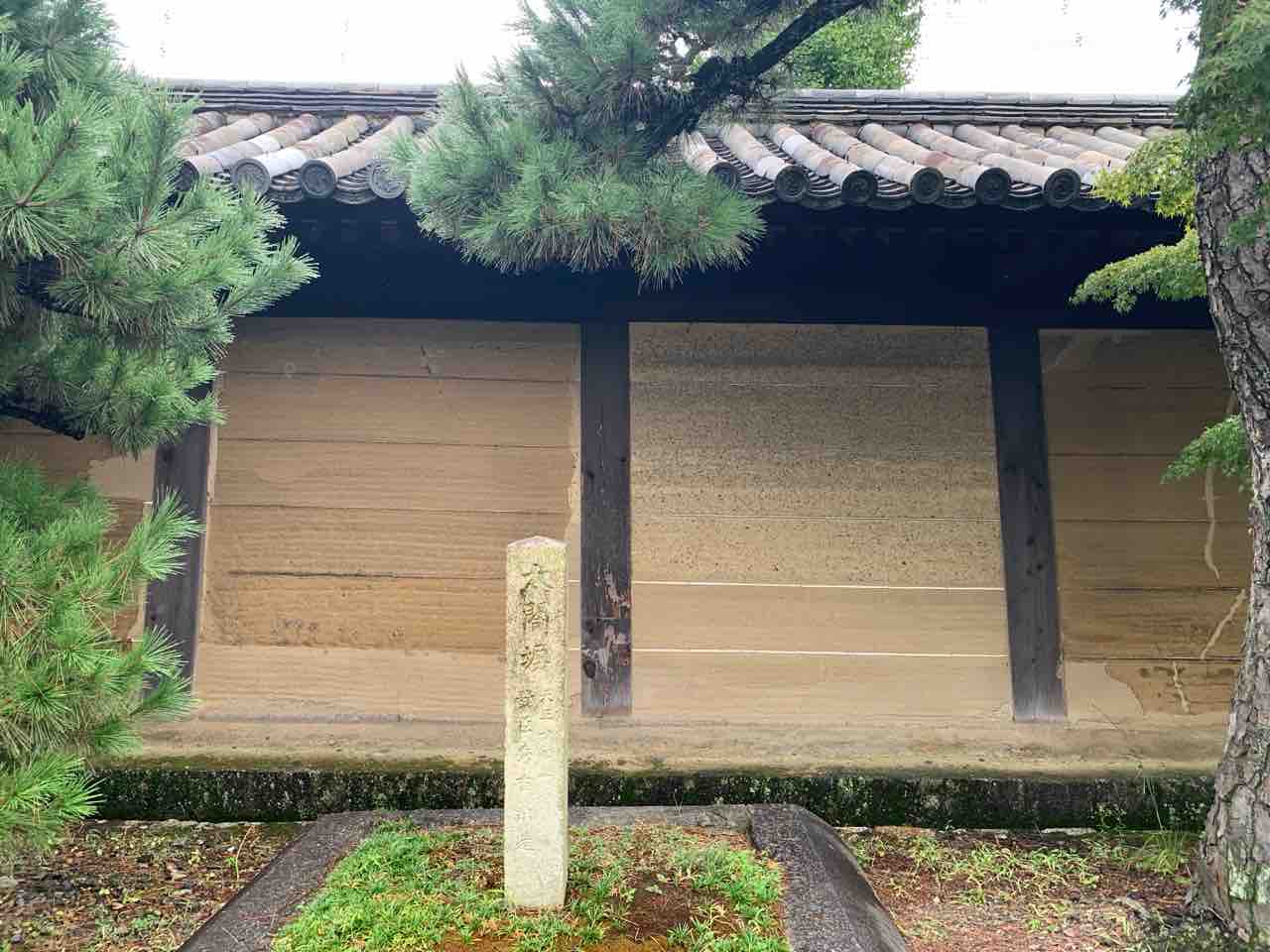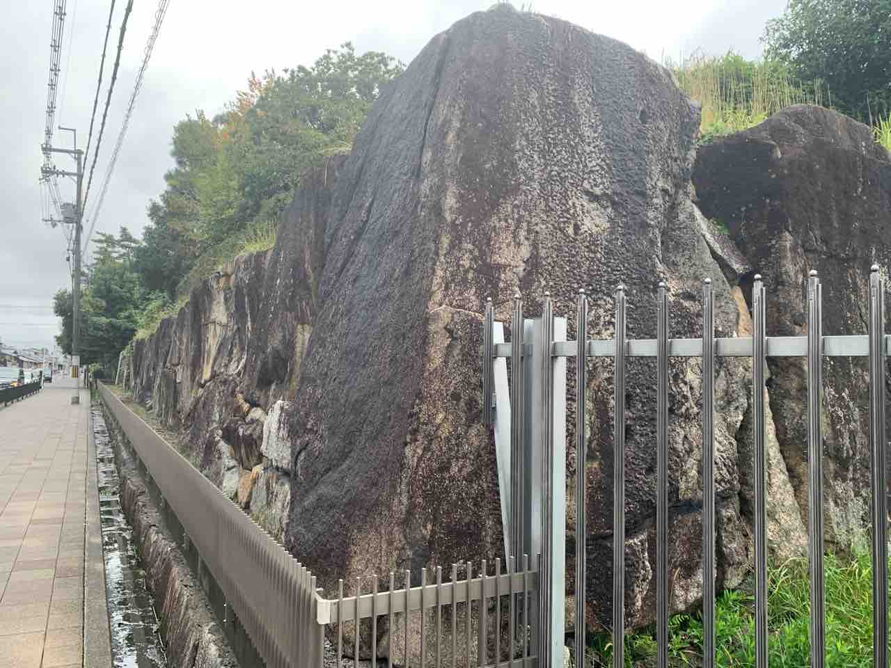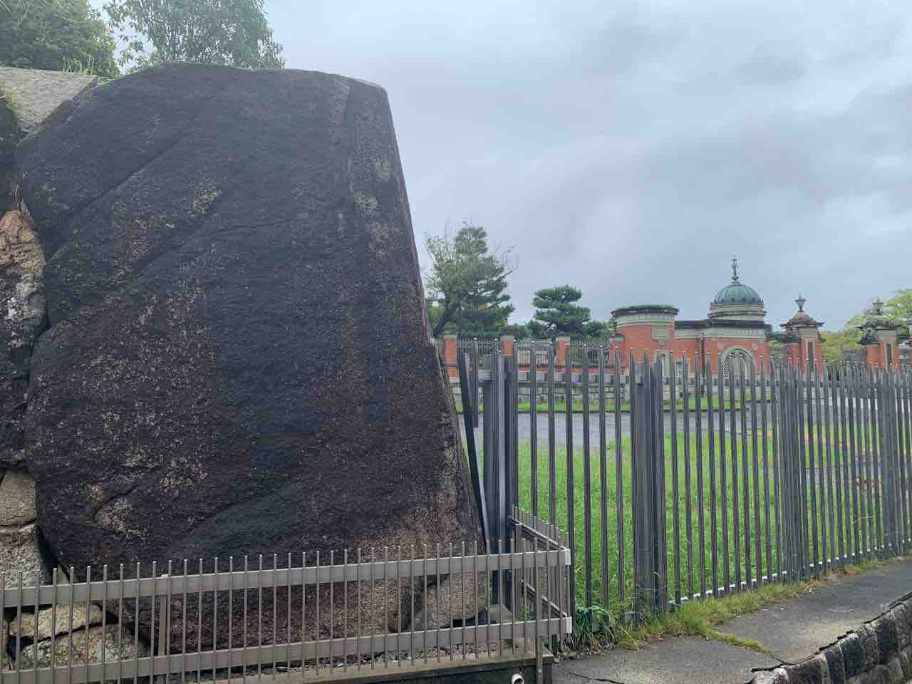 近隣の道路沿いで見られる巨石の石垣。伏見城の解体・移築にともなう遺構で、 石の大きさと積み方が桃山期のスケールを物語ります。