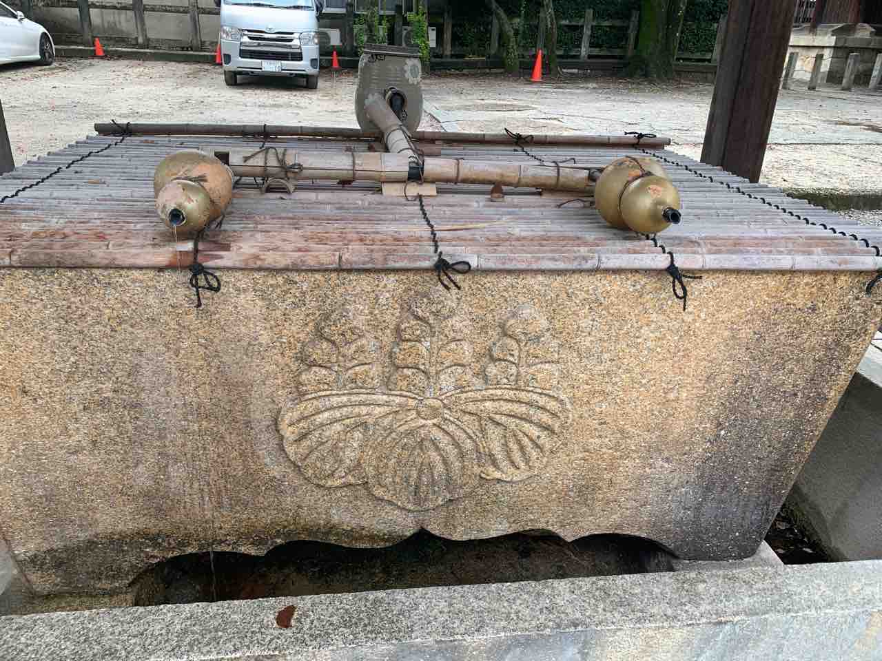 秀吉の旗印『千成瓢箪』由来の瓢箪と太閤さんの紋所『五七桐』の紋が刻まれています