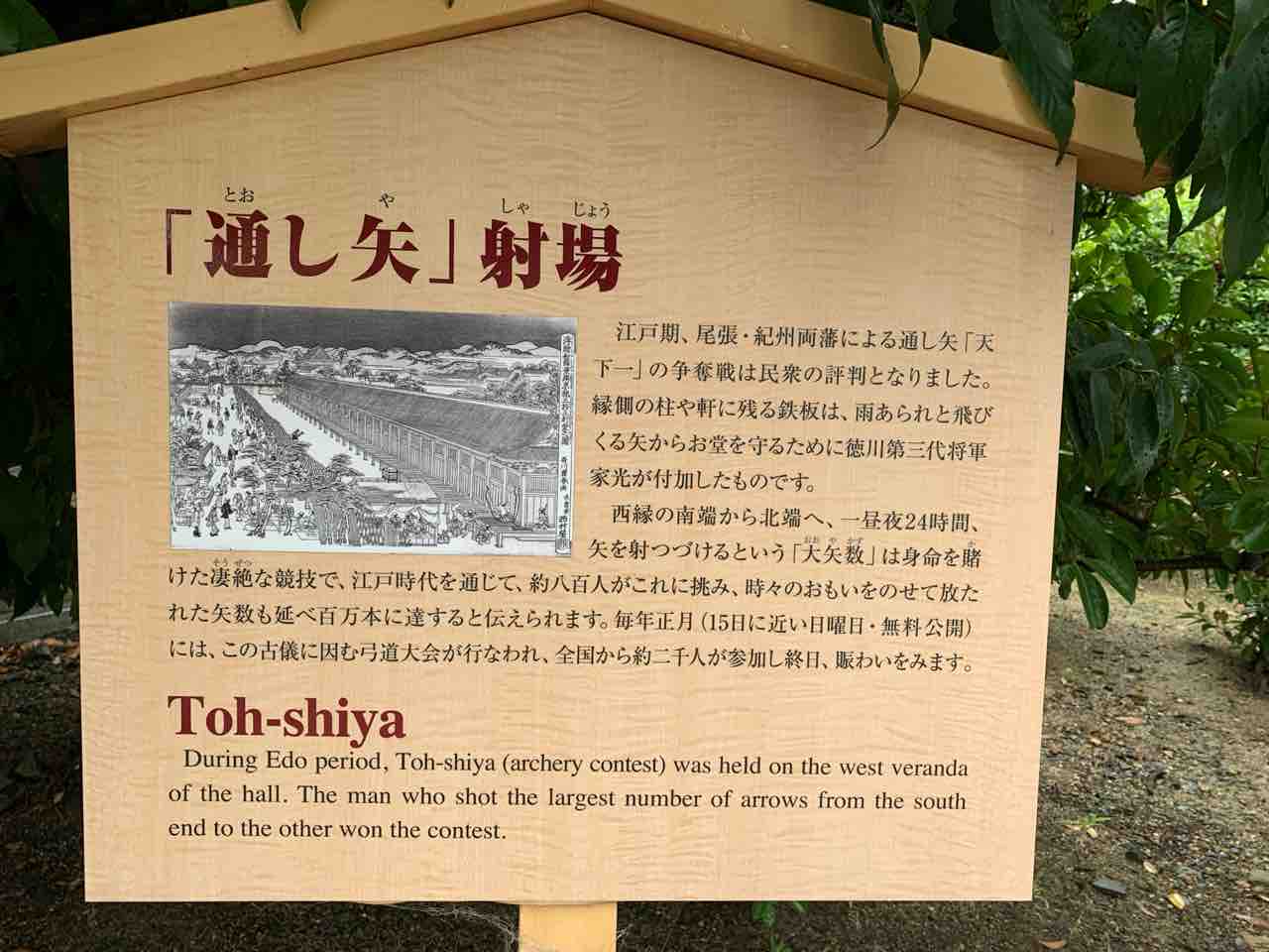 江戸期、堂の南端から北端までの約120mを射抜く弓競技「通し矢」が行われました。 一昼夜で数千〜八千本もの矢を放ったと伝わる、当時の一大イベントです。『矢継ぎ早』の語源になったと言われています