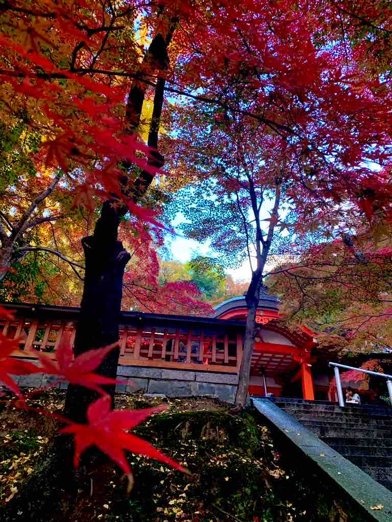 朱色の鳥居をくぐり、静かな山道を登っていくと、周囲は次第に紅葉の色づきが深まり、