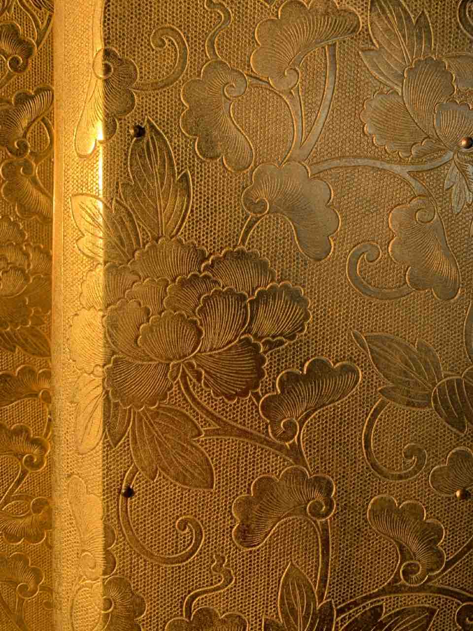 唐草や花文様が、細密に、そして立体的に彫り込まれ、 光を受けて静かに輝いていました。