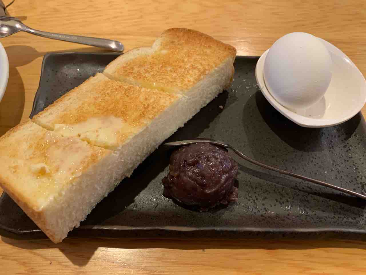 一方ワタクシは、厚切りトーストにゆで卵、そして小倉あん。 バターの塩気とあんこの甘さの組み合わせは、やはり鉄板。