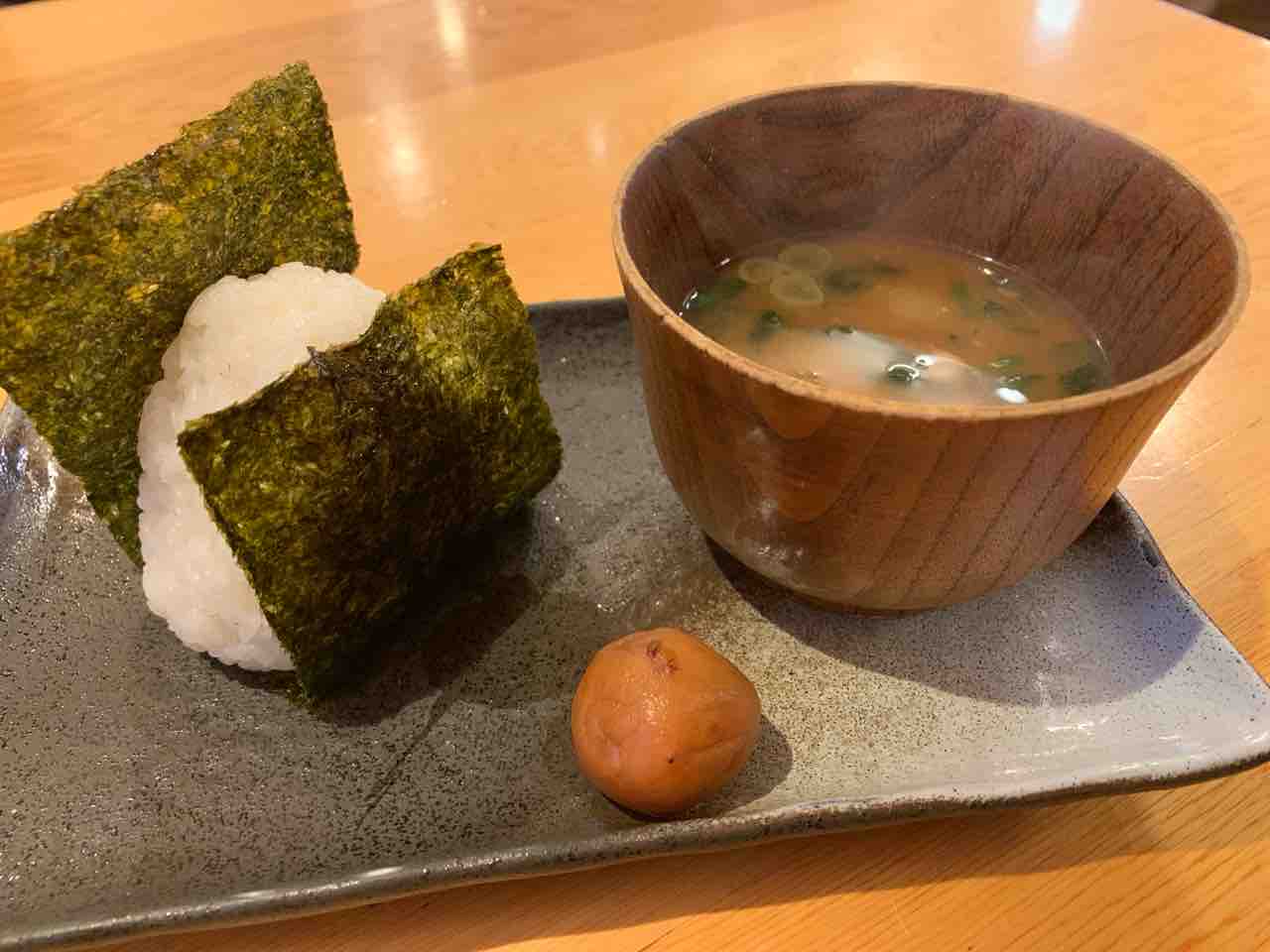 妻の人はおむすびのセット。 海苔に包まれた白いごはんと、やさしい味の味噌汁。 梅干しが添えられていて、まさに「ちゃんとした朝ごはん」です。