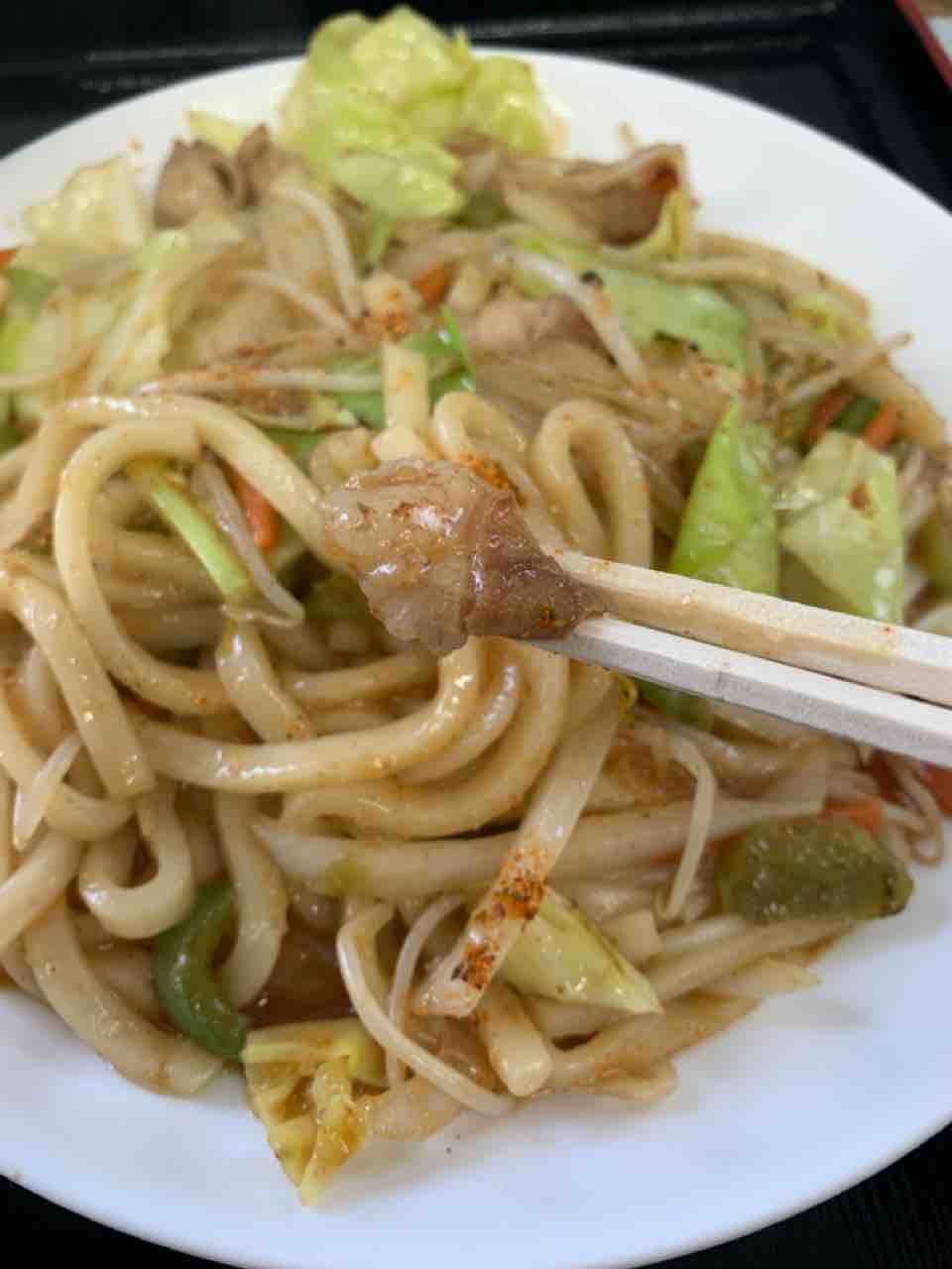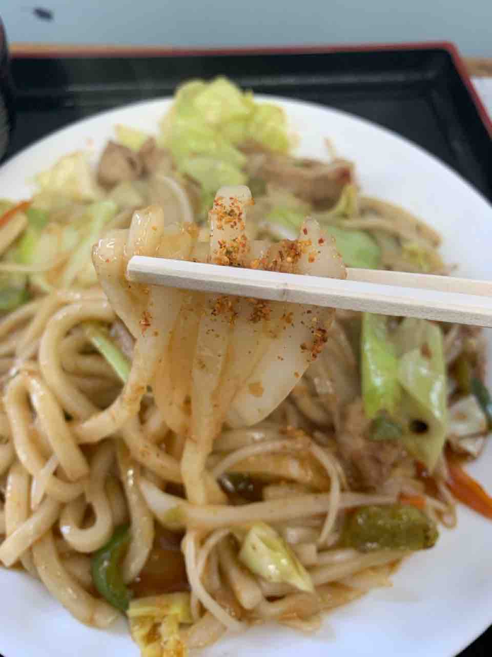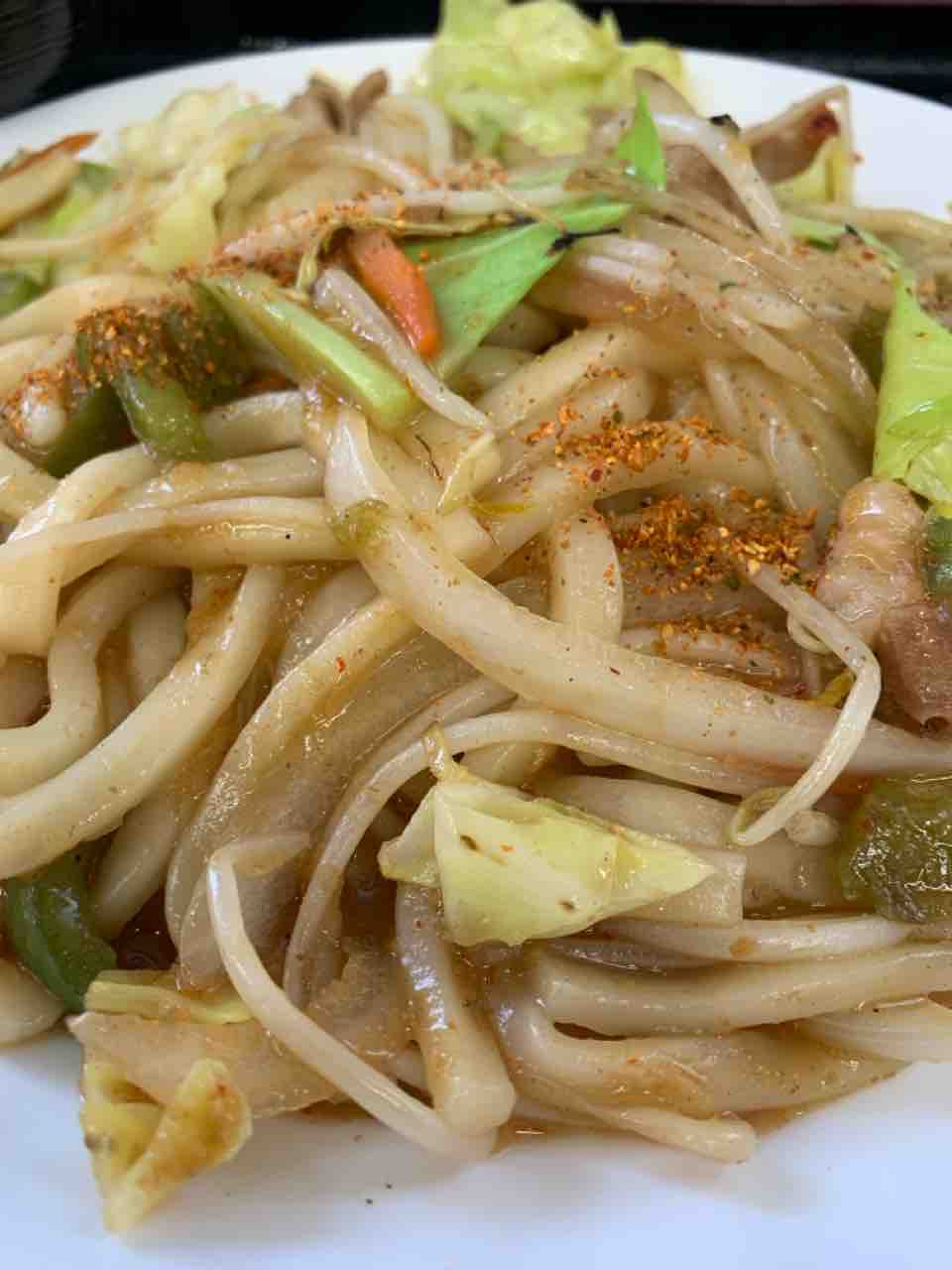 甘辛ダレで炒められたホルモンと太めのうどん、 シャキシャキ野菜に七味がよく合います。 これぞ“走ったあとの昼メシ”という一皿でした。