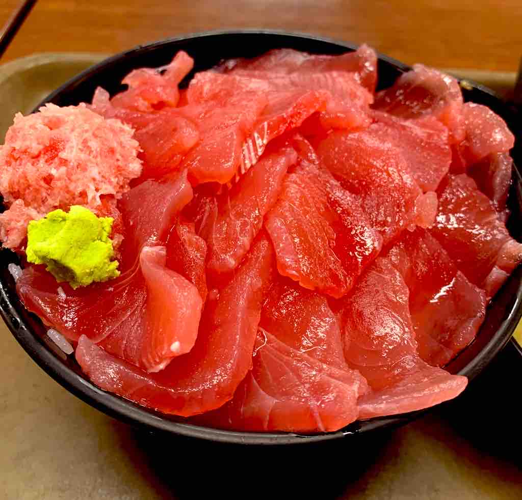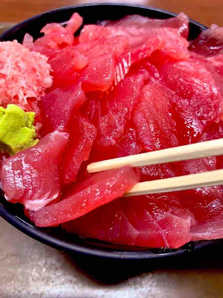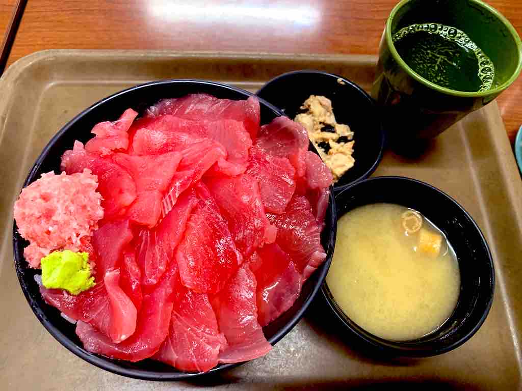 丼いっぱいに盛られたマグロが圧巻。 ネギトロ、ワサビ、味噌汁付きです。