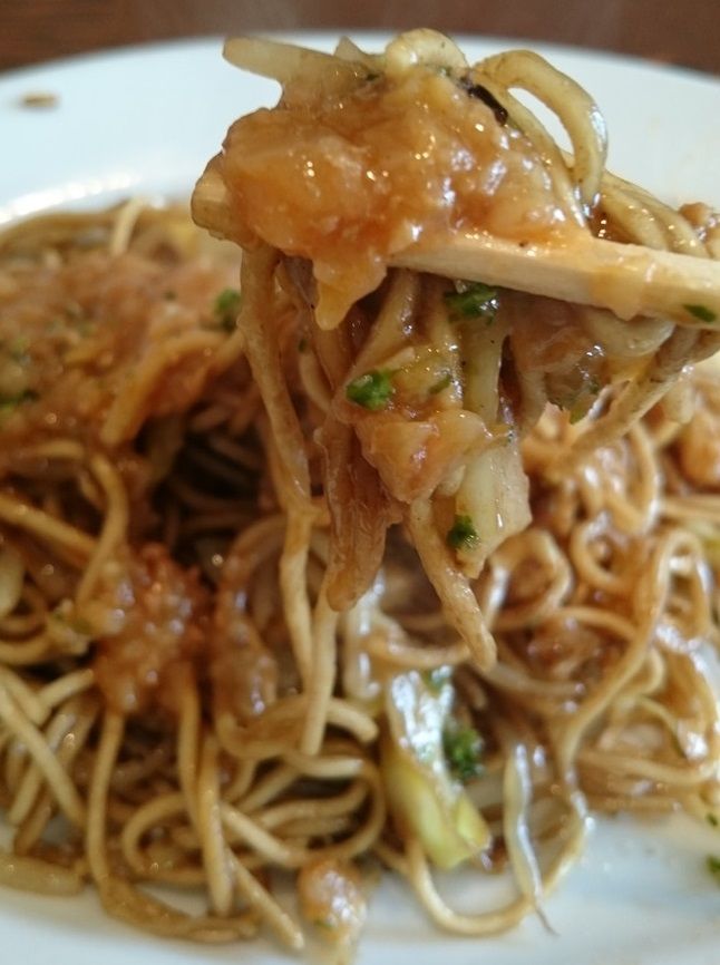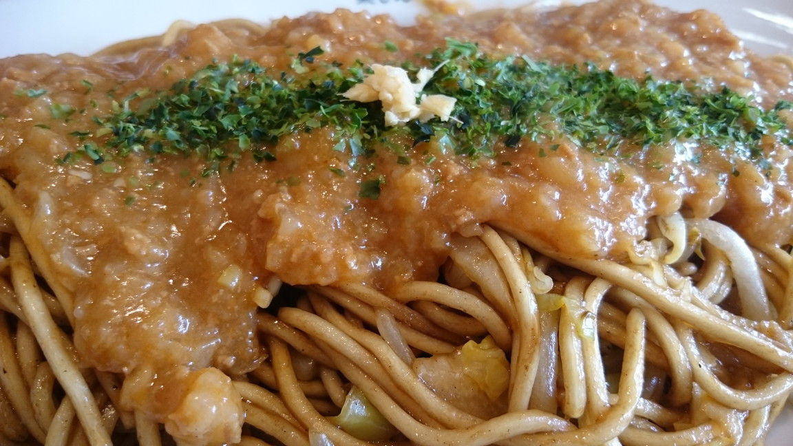 ▲⑦そして「イタリアン焼きそば」。ソース焼きそばにミートソースが掛けられています。かかっているミートソースはあまりトマト感は強くなく麺のウスターソースとのマッチングがよいのに驚きました。