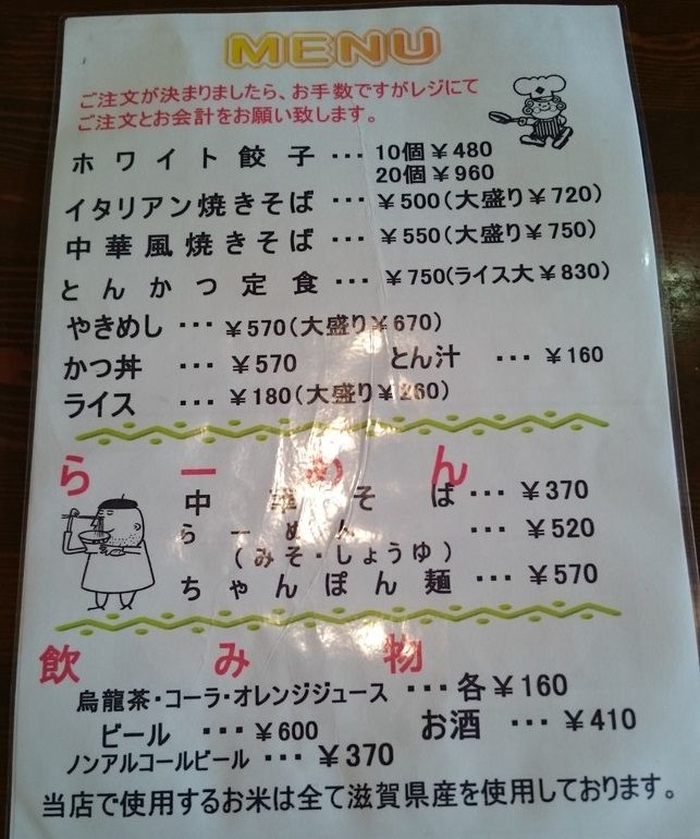 ▲②メニューは「イタリアン焼きそば」と「ホワイト餃子」の他にも「かつ丼」、「焼き飯」と中華料理屋なのか定食屋なのか。街の食堂といった感じなのでしょうかね。
